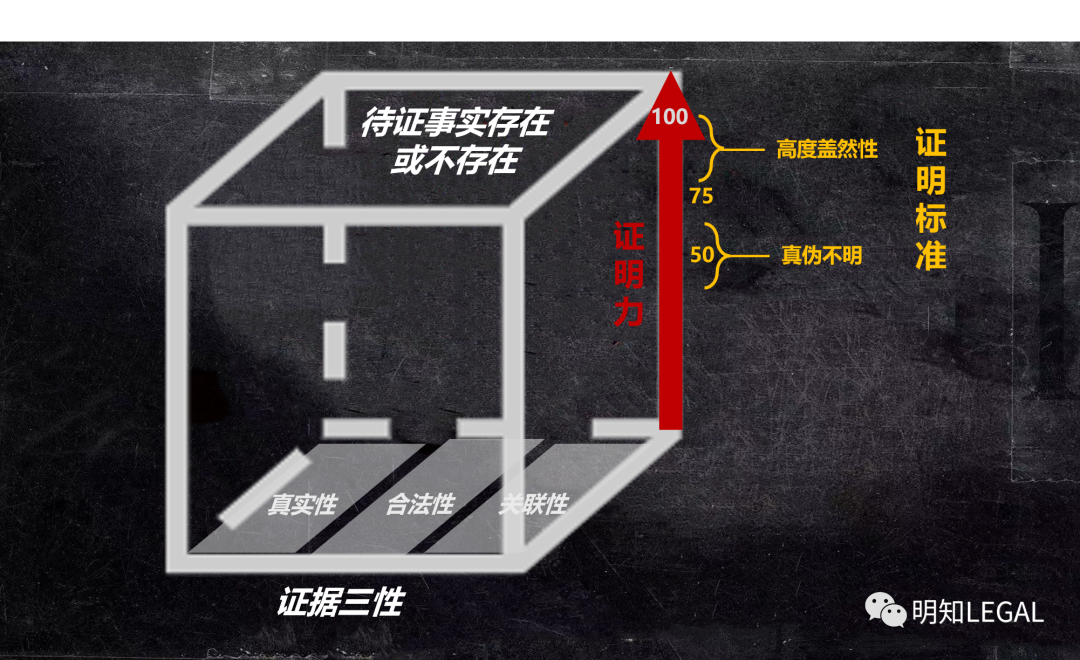 证明价值是站在实质关系上对证据的进一步要求,强调该证据对待证事实存在或不存在有证明的效力。换言之,就是分析证据能否令待证事实存在的可能性变的更大或者更小。比如之前的监控视频,虽然确实在侵权的时间对侵权的地点和人物进行了拍摄,但由于视频像素过低,画面模糊,无法进一步判断行为人有没有打人,对侵权事实存在或不存在的可能性不产生影响,那么该份证据虽然有实质关系但不具有证明价值。
