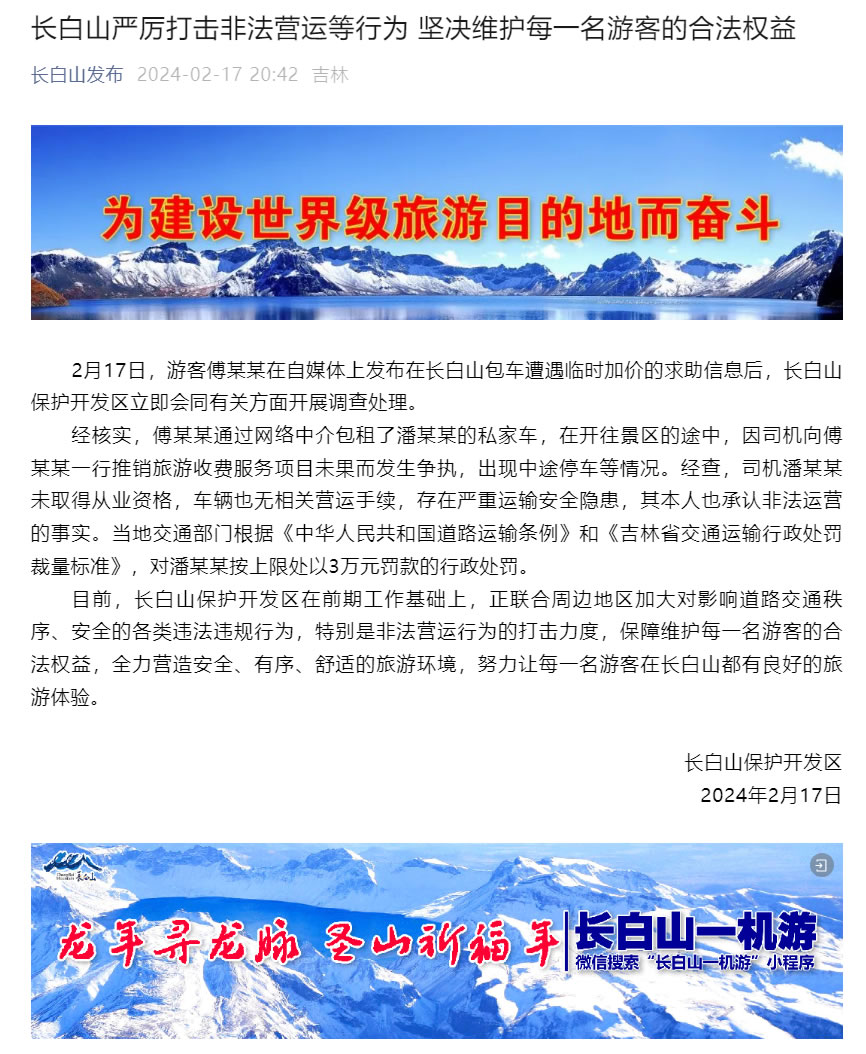 2月17日,游客傅某某在自媒体上发布在长白山包车遭遇临时加价的求助信息后,长白山保护开发区立即会同有关方面开展调查处理。