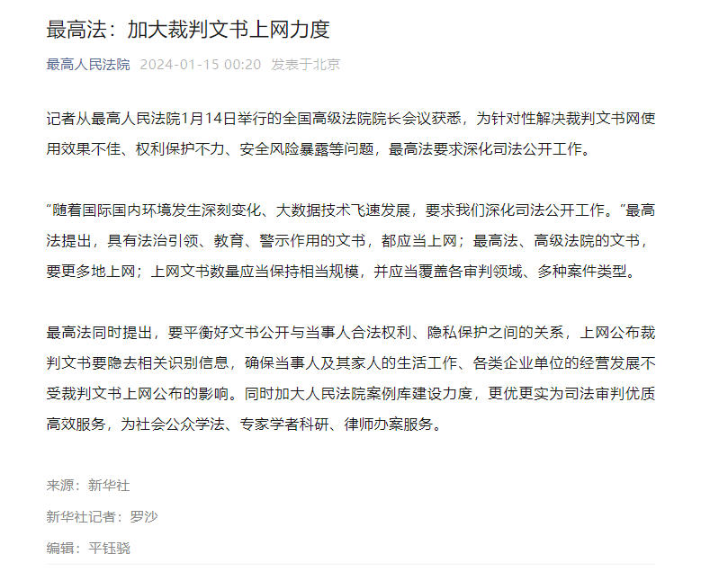 2024年1月15日,最高人民法院微信公众号刊发新华社消息,最高人民法院在1月14日举行的全国高级法院院长会议要求深化司法公开工作。具有法治引领、教育、警示作用的文书,都应当上网;最高法、高级法院的文书,要更多地上网;上网文书数量应当保持相当规模,并应当覆盖各审判领域、多种案件类型。