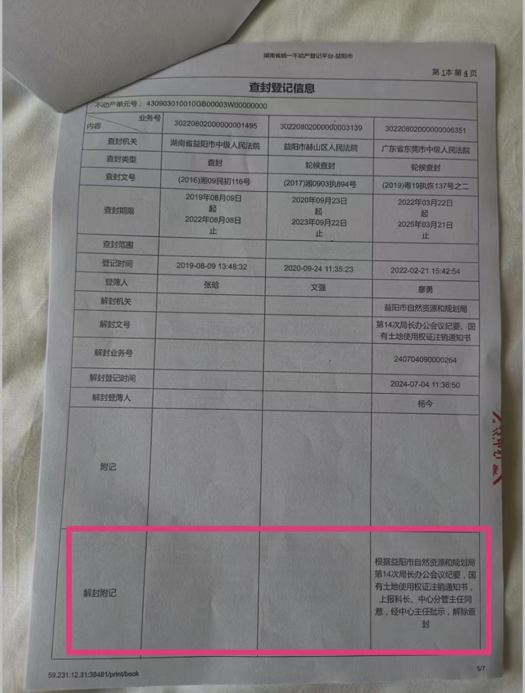 2024年5月,东莞中院选定评估机构、现场调查土地状况,准备对该土地进行拍卖处置。同年10月,当东莞中院向益阳市不动产中心调取土地权属登记现状,却得到反馈:涉案土地已于2024年7月4日被解封。解封“附记”是,根据益阳市自然资源和规划局第14次局长办公会议纪要、国有土地使用权证注销通知书,上报科长、中心分管主任同意,经中心主任批示,解除查封。