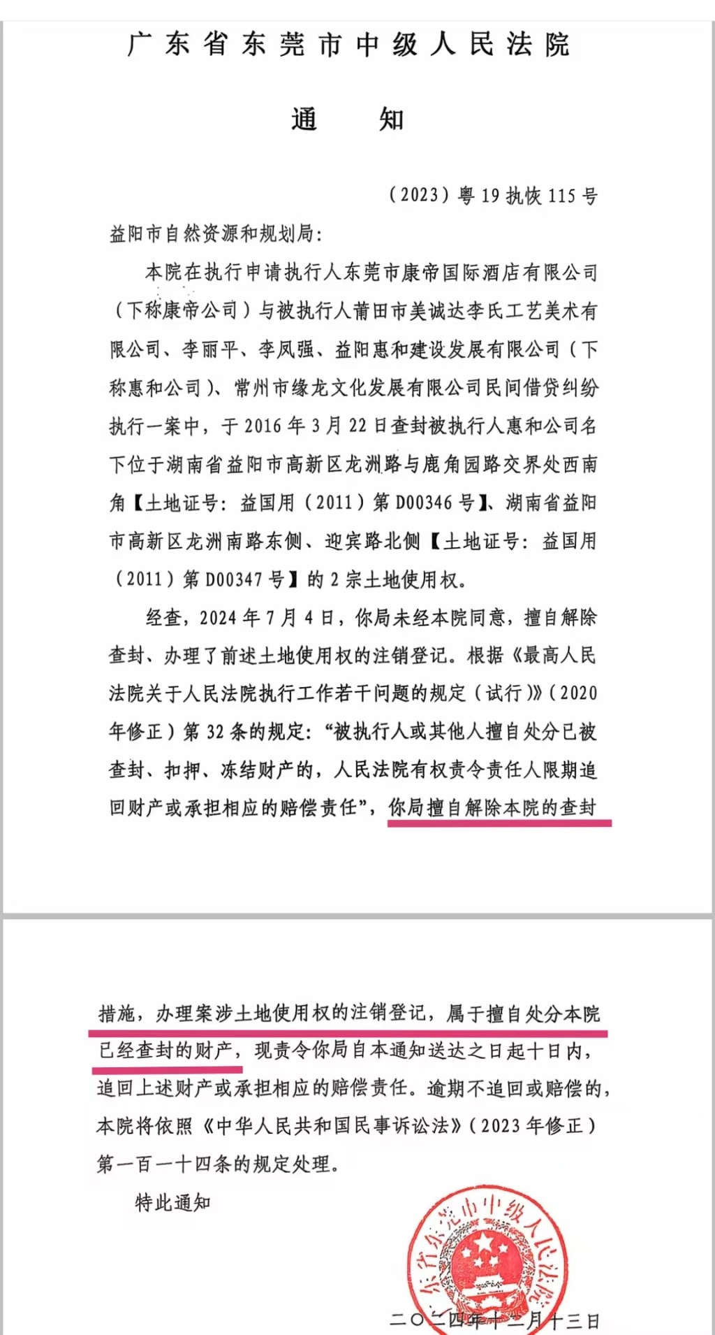 在后续又多次协商无果的情况下,2024年12月13日,东莞中院向益阳自规局发出(2023)粤19执恢115号《通知》。