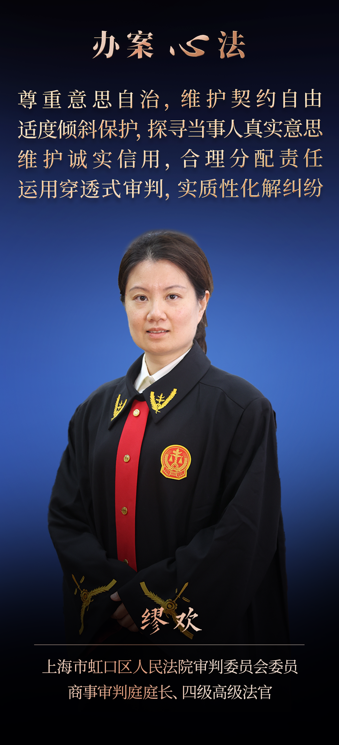 缪欢,华东政法大学法学硕士,现任上海市虹口区人民法院审判委员会委员、商事审判庭庭长、四级高级法官。获评上海法院办案标兵、审判业务骨干等。带领审判团队荣获上海法院青年文明号称号。主审多个案件入选《人民法院案例选》,上海法院精品案例、示范庭审等。
