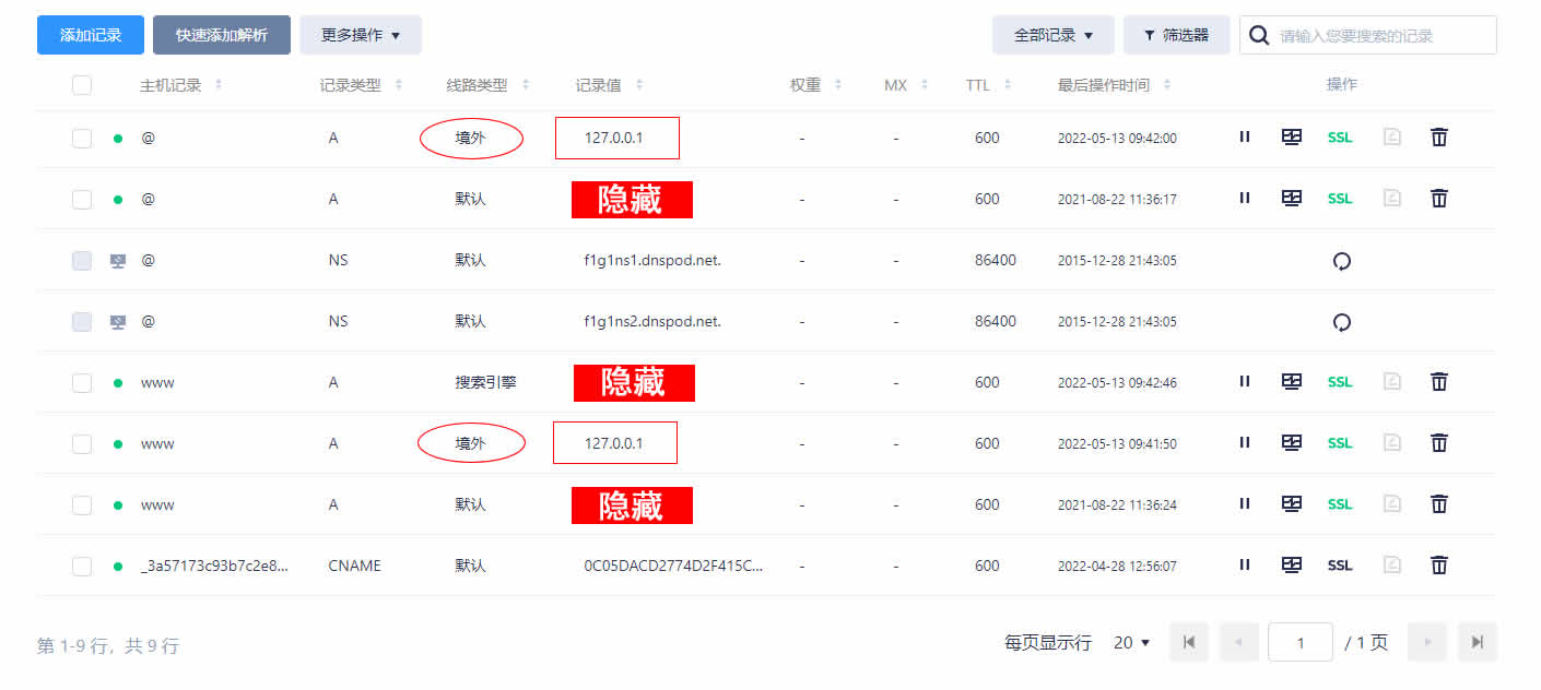 (一)首先以腾讯云旗下DNSPOD为例,将境外ip访问时的A记录解析到访问者本机ip127.0.0.1上(见下图所示)。同时为了不屏蔽境外谷歌和必应等有益搜索引擎抓取网站,您可以将来自于搜索引擎访问的线路解析到您的网站服务器真实ip上。但由于你已屏蔽了境外ip访问网站,即便境外谷歌和必应抓取了你的网站数据,但境外ip用户依然不能通过谷歌和必应引流访问你的网站,好处是您的网站数据被境外谷歌和必应等有益搜索抓取并保留了数据。