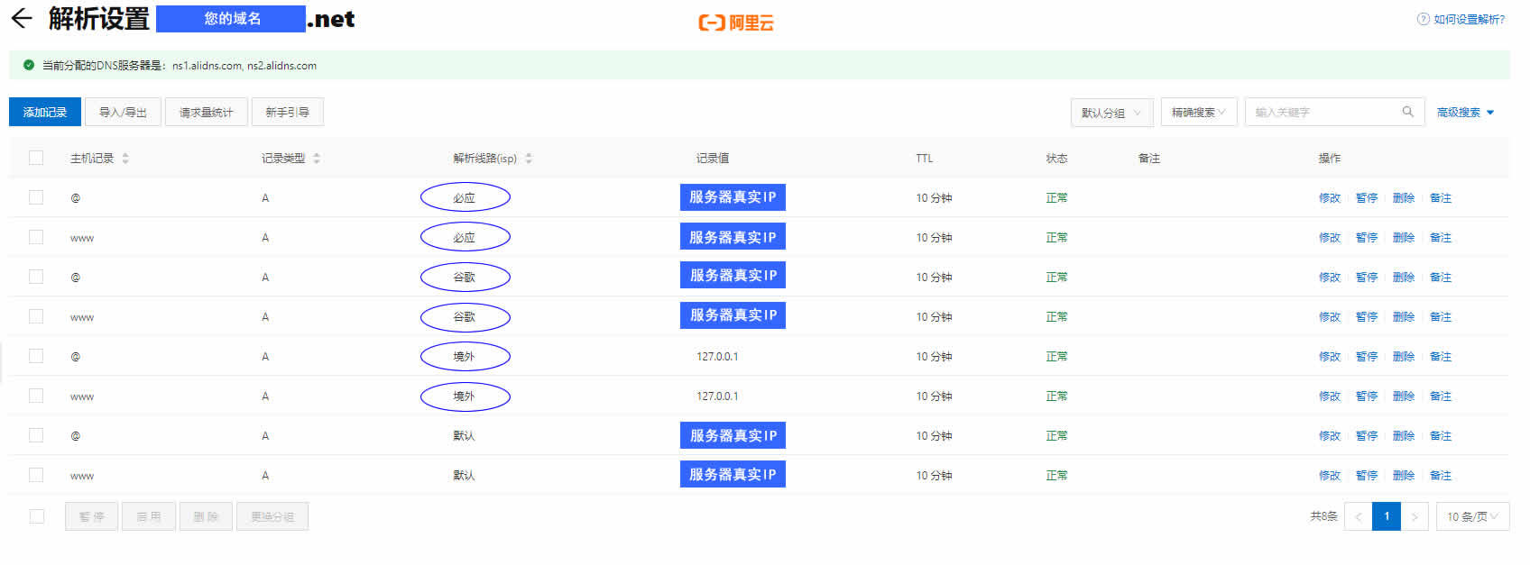 (二)另外,你也可以利用阿里云的域名解析,实现与DNSpod一样的功能(见下图所示),各位可自行验证测试判断。
