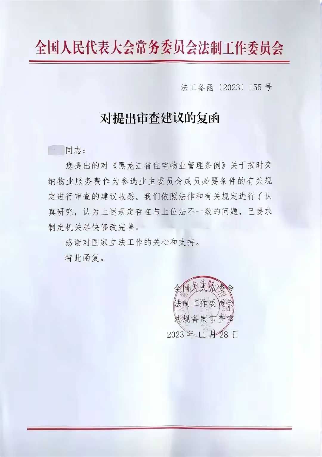 2020年5月十三届全国人大三次会议审议通过《中华人民共和国民法典》,2021年1月1日起正式实施。此后,全国人大常委会法制工作委员会收到公民、组织提出的地方物业管理条例关于限制业主共同管理权有关规定与《中华人民共和国民法典》关于建筑物区分所有权有关规定不一致的审查建议43件,其中,针对“业主不按时交纳物业服务费不得参选业主委员会成员”相关规定提出的审查建议37件,涉及13件地方物业管理条例;针对“业主有拒付物业服务费、公共水电分摊费和不交存物业维修资金等不履行业主义务行为的,业主大会可以在管理规约、业主大会议事规则中对其参加业主大会、行使投票权等共同管理权的行使进行限制”相关规定提出的审查建议8件,涉及3件地方物业管理条例。在司法部移送法制工作委员会审查研究的可能存在问题的地方性法规中,有2件法规涉及上述情况。