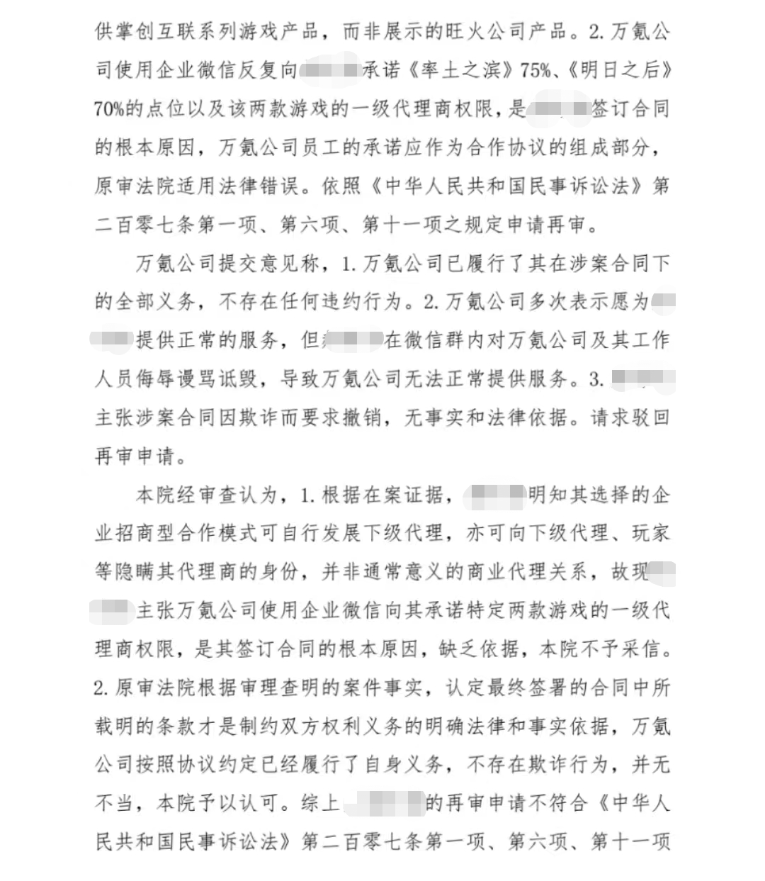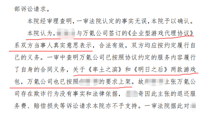 2、我要网易的两个游戏代理万氪给我说他们有,当时我去他们公司的时候给我看了个后台显示是有的。然后我交了钱他们给我搭建平台,最后我发现他们压根没有这两个游戏。协商无果就起诉了。 种种原因都败诉,两个游戏没拿到,他们给我搭建的平台也没法用。根本用不了,拒绝提供服务。